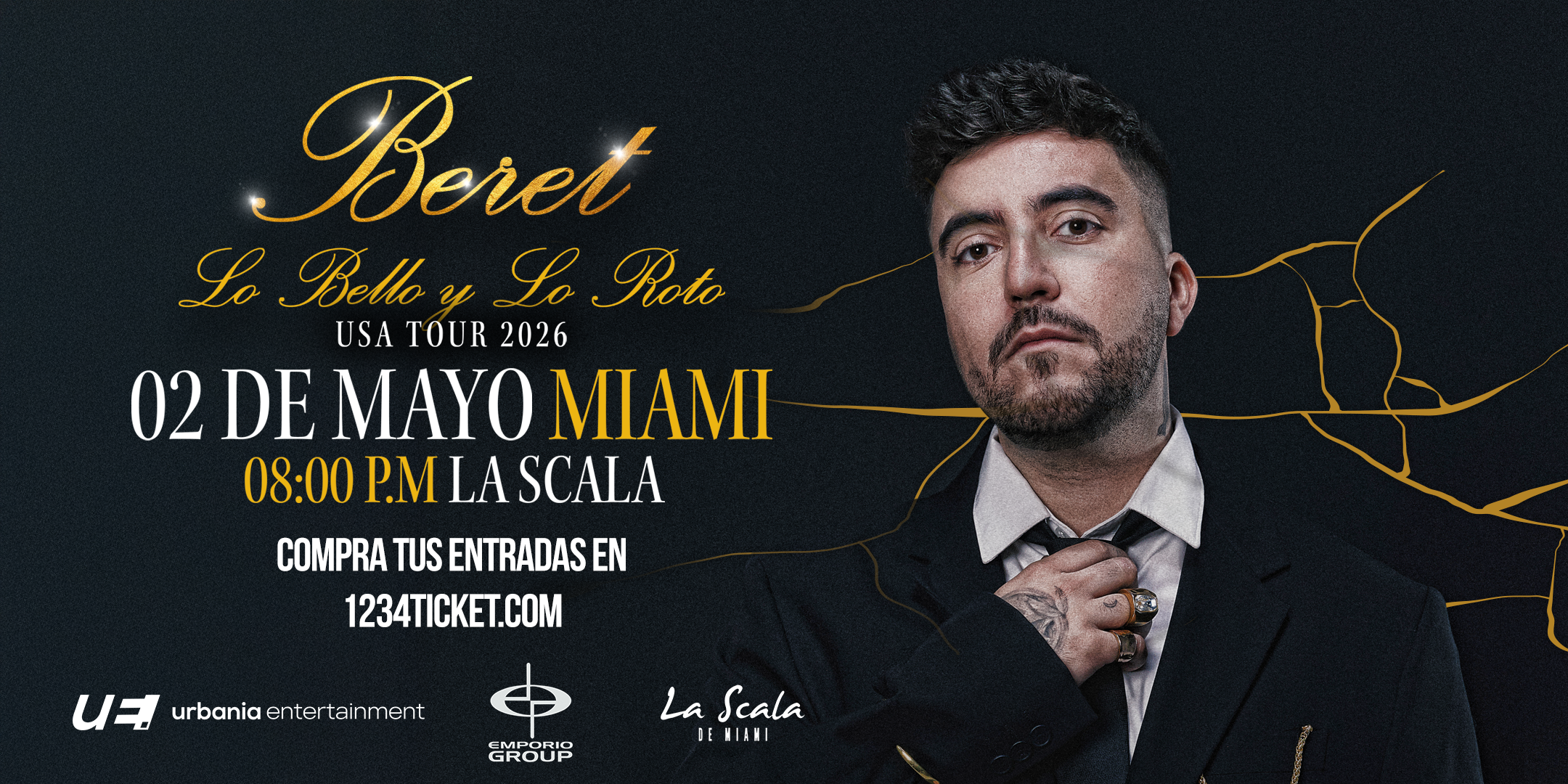 El reconocido artista español Beret regresa a la Miami con una gira que promete reencontrarlo con uno de los públicos más fieles de su carrera. Con una propuesta íntima y emocional, el cantautor presentará su nuevo álbum “Lo bello y lo roto”, y así recorrerá los escenarios de las principales ciudades de América en mayo de 2026.