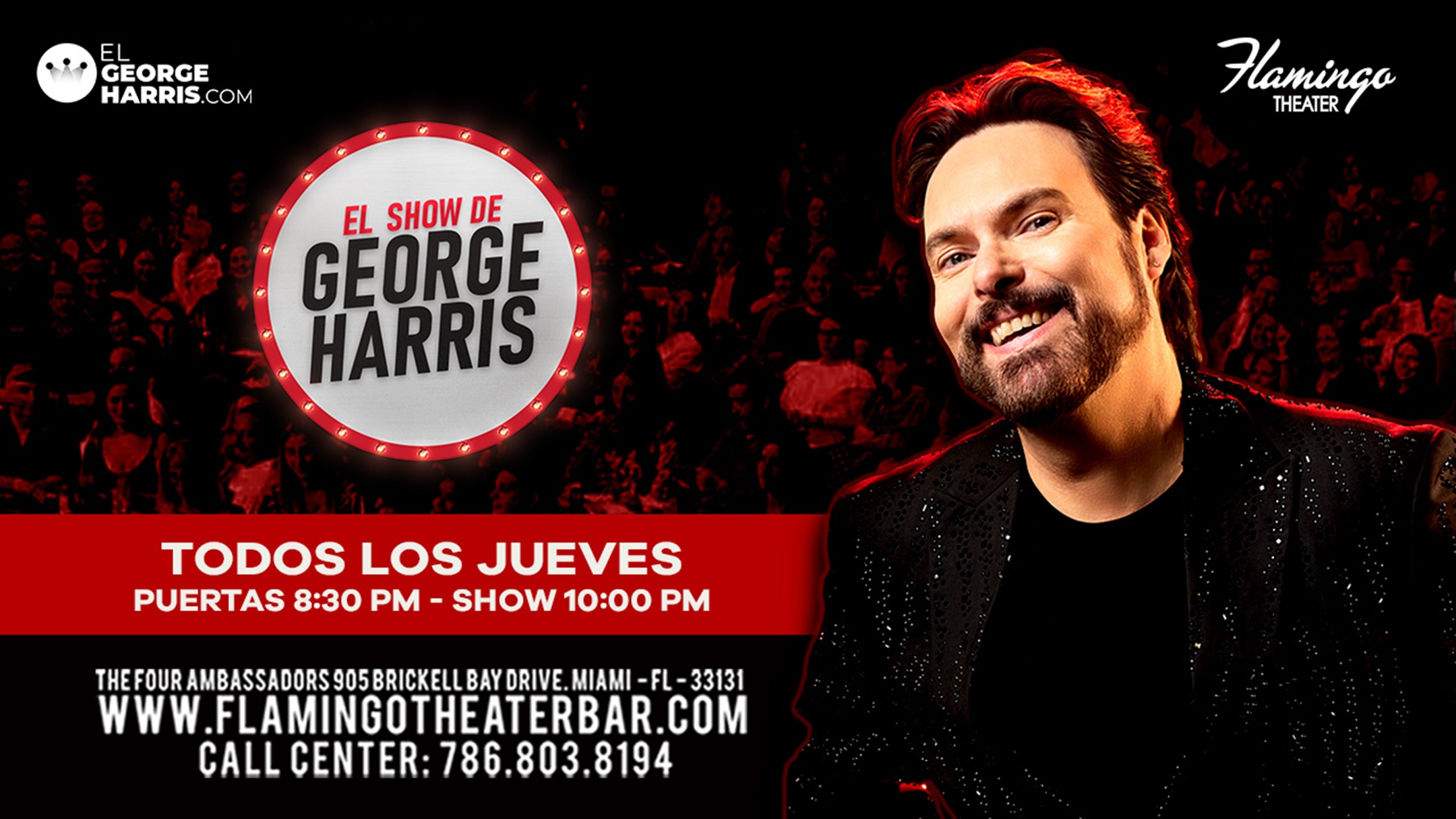 George Harris, comediante y periodista venezolano nos trae un Show Stand up cargado de humor y noticias, acompañado por invitados especiales todos los jueves. Las puertas abren a las 8.30pm, el show comienza a las 10pm, en La Scala de Miami. No se admite el ingreso a menores de 13 años, PG-13. Está prohibido tomar fotografías o videos durante el show.